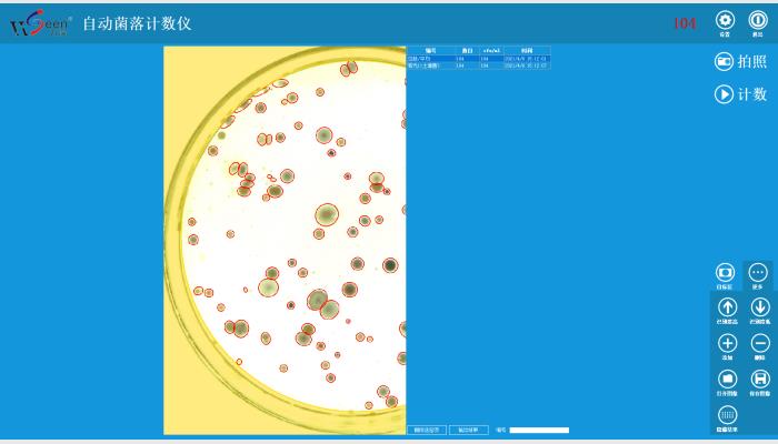 3、一鍵拍照自動計數精度≥96.5%,極少修正后可達100%正確。分析速度:50~500個菌落/s(計數分析耗時1~4秒)。對顯色培養基培養出來的大腸桿菌群也能有效自動計數。可自動識別計數≥0.1mm的菌落。