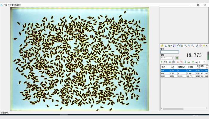 4、將種粒散放在背光板上的成像盤中拍照計(jì)數(shù),再將種粒倒入收納小盒放到帶RS232通訊線的電子天平上,1秒鐘穩(wěn)定后,即將重量數(shù)據(jù)送至電腦中分析系統(tǒng)對(duì)應(yīng)的重量欄,算出該樣品種粒的千粒重值和平均粒形值。千粒重分析速度:1200~20000粒/分鐘。