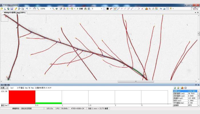 (11)能進行根系的顏色分析,確定出根系存活數量,輸出不同顏色根系的直徑、長度、投影面積、表面積、體積。