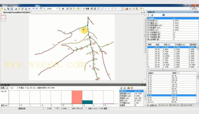 (12)能進行根系的拓撲分析,自動確定根的連接數、關系角等,還能單獨地自動分析主根或任意一支側根的長度和分叉數等,可單獨顯示標記根系的任意直徑段相應各參數(分檔數、檔直徑范圍任意可改,可不等間距地自定義),并能進行根的分叉裁剪、合并、連接等修正,修正操作能回退,以快速獲得100%正確的結果。