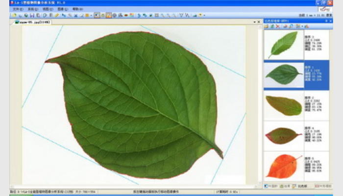 2、可大批量全自動分析多片葉葉面積、周長、最大葉長、最大葉寬、矩形度、凹凸比、球狀性、形狀系數和蟲洞數量,并標記葉片邊緣以便核對正確性。