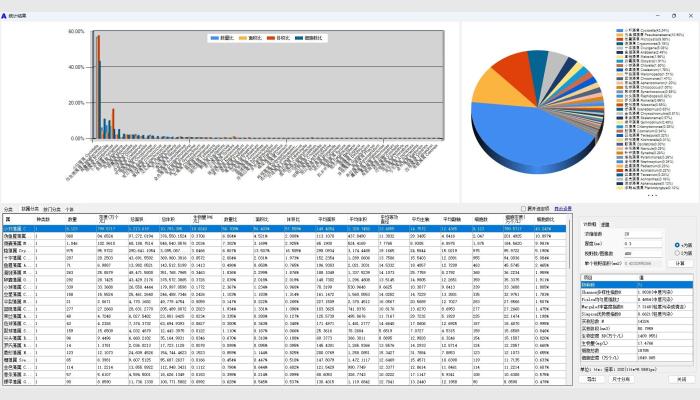 (5)自動計算香農-威納指數(shù)(Shannon-Wienner)、均勻性指數(shù)(Pielou)、豐富度指數(shù)(Margalef)、藻個體密度、藻細胞密度、生物量、Simpson生態(tài)優(yōu)勢度指數(shù)及水質評價等。可分析獲得每個藻類細胞面積、周長、體積、長、寬、主軸、副軸、等效直徑等形態(tài)參數(shù)。可分析統(tǒng)計各藻類的數(shù)量、面積、體積及其占比;對各分類進行排序及柱狀圖、餅圖顯示占比情況。